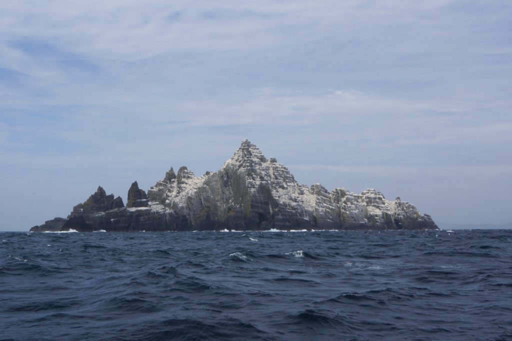 kleiner Beibootausflug durch eine Meerenge zwischen zwei Inseln, bei Seen Harbour Skellig Islands, ein Insel war von Mönchen bewohnt, diese hier ist die Vogelschutzinsel