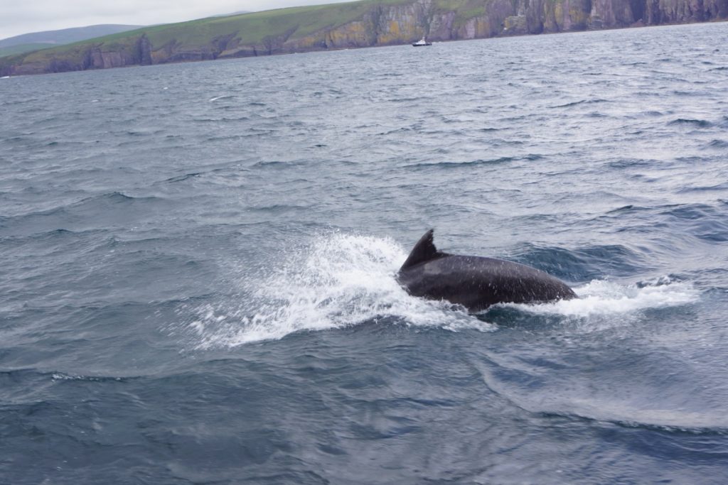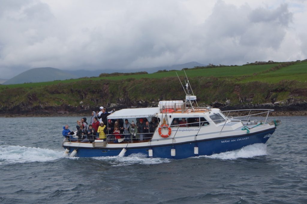Beim Verlassen des Hafens schon unter Genua überholten uns eilig mehrere kleine Boote. Draussen am Eingang zur Bucht warteten bereits weitere Boote. Als wir dort ankamen, vernahmen wir Juchzen und hingerissen begeisterte Rufe. Ursache des Verkehrsaufkommens war Funghie wie auch Jogi schnell von achtern bestätigte, „da ist er!“… Mitten zwischen den Booten war der bekannte Delphin kurz aufgetaucht, um gleich wieder zu verschwinden. Wir waren zufällig life beim Dolphin Watching dabei. Hatte ich ganz vergessen, dass der berühmte Dingle Delphin ja so nah in die Hafenbucht kommt. Wenige Augenblicke später tauchte er kurz bei Tordas auf, außer Sichtweite der anderen Boote. Als ob er sich verstecken wollte und verschwand wieder. Kaum hatten die anderen Boote ihn ausgemacht, jagten sie auch schon volle Fahrt hinterher.
