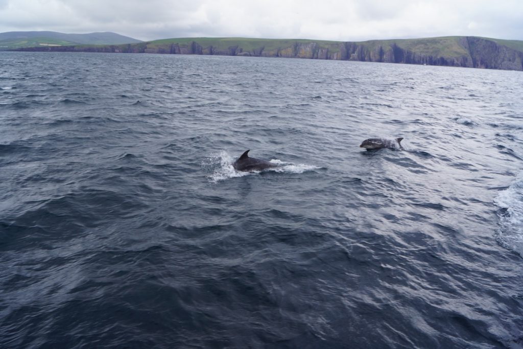 Übrigens wurde unsere Zurückhaltung belohnt. Weiter draussen in der Dingle Bucht haben wir eine große Delphinschule getroffen und Funghie mittendrin. Seinen Sozialverband hat er also dort draussen. Bemerkenswert, wie Funghie mit dem Touristenansturm umgeht. Er kommt aus eigenem Antrieb zu den Booten. Und verschwindet wieder, wenns ihm reicht. Richtig so Funghie!