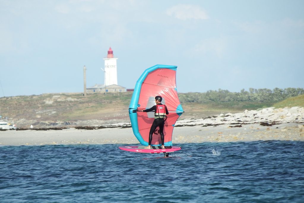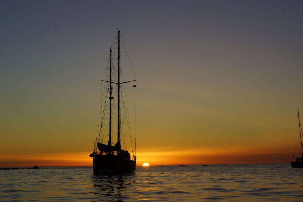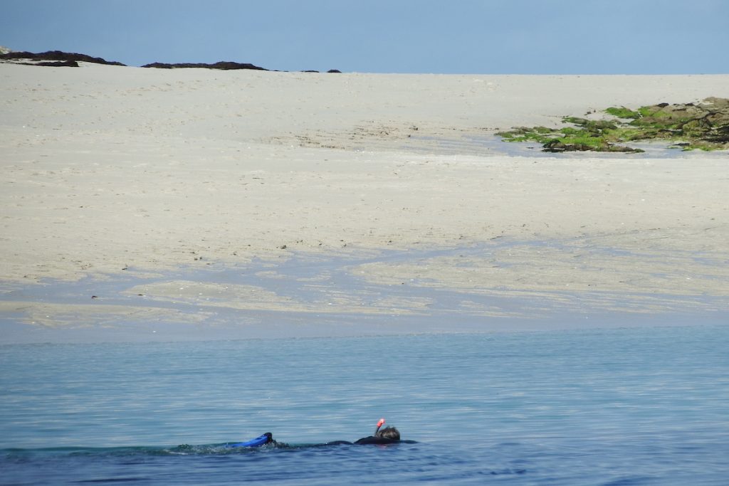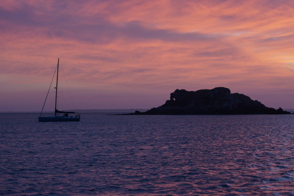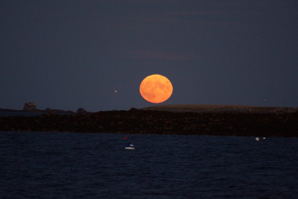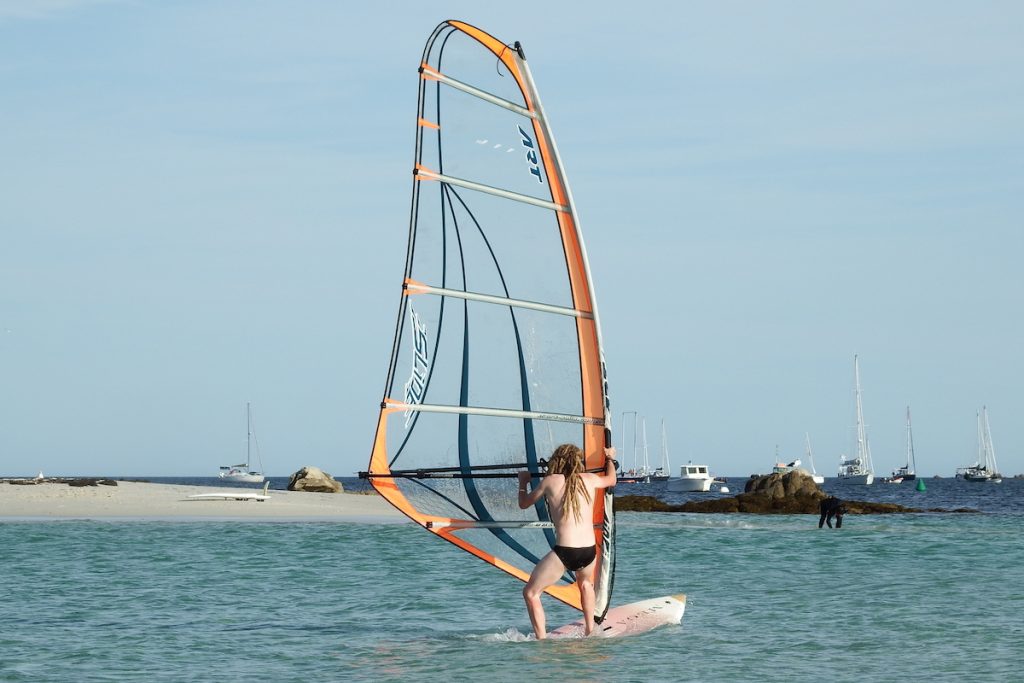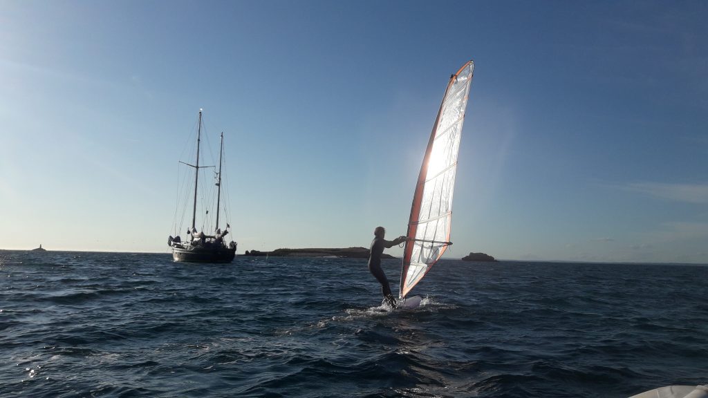 Bis wir auf den Glenan ankamen hatten wir unsere ersten Delphinschulen gesichtet. Bei St. Nicolas wurde geschnorchelt und gesurft. Seit Jahren schleppen wir meine alte Surfausrüstung mit und auf dem Glenan Archipel war es dann soweit. Malte und ich haben Segel, Gabelbaum, Mast, -fuss, mehr schlecht als recht zusammengepfuscht. Wir haben uns wohl sehr schlimm angestellt. Denn ein netter Mensch, der neben uns am Strand mit Freunden saß und selbst jahrelang das Windsurfen gelebt hat, konnte sich das Drama nicht mit anschauen und und eilte uns zu Hilfe. Mit seinem Kumpel hat er den Trimm abschliessend perfektioniert. Los gings mit Beachstart. Denn das Brett hat zu wenig Auftrieb für einen Einsteiger-Start vom Board aus. Neu für Malte, aber er gab nicht auf und hat schließlich doch mal auf dem Board gestanden. Ich war erstaunt, dass es mir nach kurzer Zeit doch so leicht gelang los zu kommen. Wasserstart und Halsen kommt dann beim nächsten Mal. Abends waren wir wunderbar erschöpft und haben den Abendhimmel mit einem rosa-großen Mond genossen.